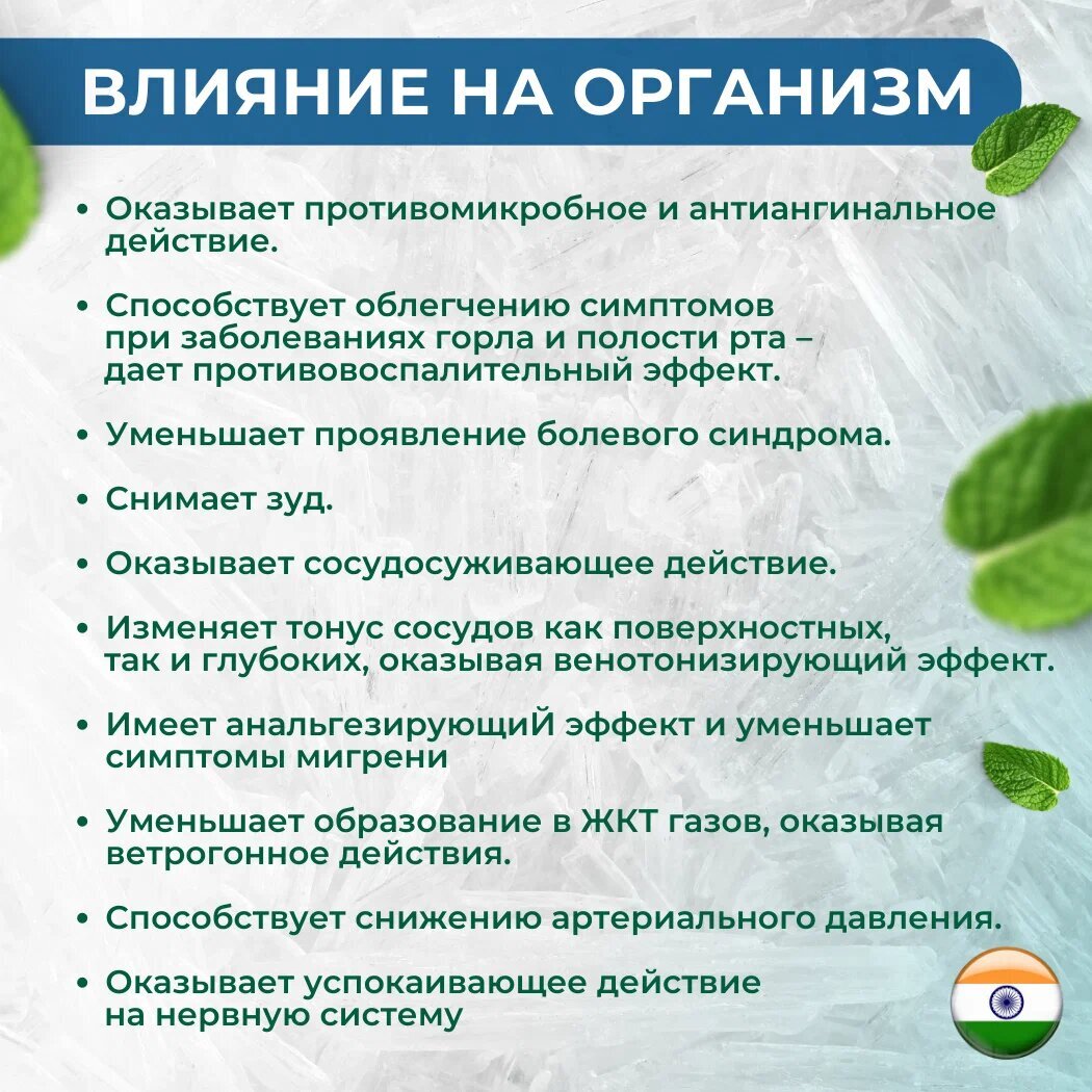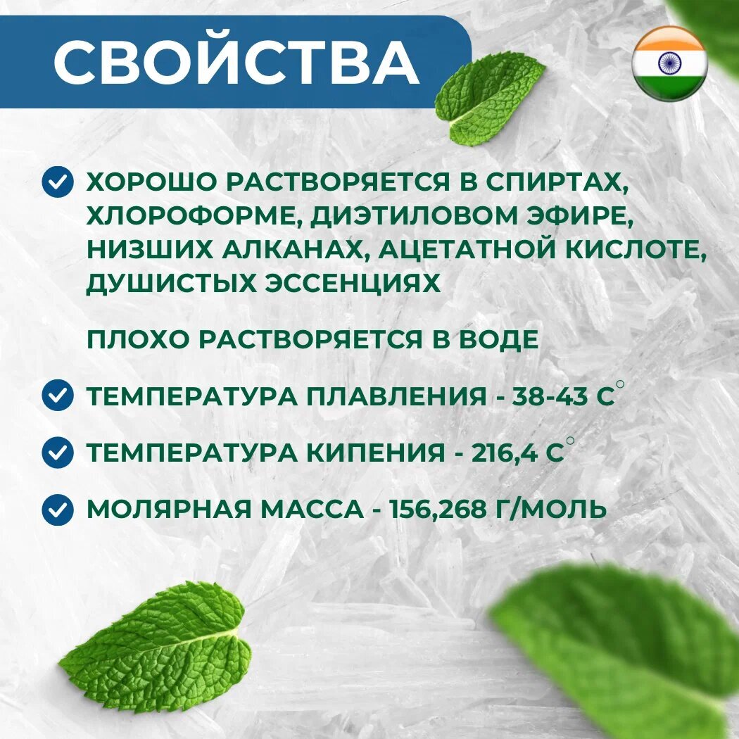 Кристаллический ментол является важным продуктом для создания косметических средств. Представленный товар от бренда «Farmanova» поможет улучшить кожу и здоровье в целом. Этот твердый натуральный продукт представлен в банке 25г. Это идеальное средство для ухода за кожей лица и тела. Его охлаждающий эффект обеспечит уменьшение отеков, заболевания гриппа и простуды. Он может применяться как противовоспалительное и увлажняющее средство для чувствительных и проблемных участков кожи. Хороший вариант для создания косметических кремов, туалетной воды, шампуня, зубной пасты и ополаскивателя для рта. Ментоловый запах добавляет свежести и аромата в баню или сауну, а также помогает улучшить кровообращение. Твердая основа прочной упаковки маленького объема обеспечивает эффективное использование кристаллов ментола. Это экологичное и профессиональное средство можно использовать для комплексного улучшения здоровья и красоты. Готовые средства с таким продуктом прекрасно снижает отеки, предотвращают воспаления, улучшают кровообращение, тонус кожи. Также может использоваться для ингаляций во время профилактики и лечения кашля, болезней горла и гигиены носа. Кристаллический ментол, как и настойки, обладает отличным успокоительным действием, поможет избавиться от усталости, нормализовать сон и улучшить общее состояние. Это идеальное средство для ухода за кожей и здоровьем взрослых женщин. Натуральный продукт в форме кристаллов помогает избавиться от следов целлюлита, уменьшить потоотделение. Он подходит для добавки в косметику, а также для лечебных ингаляций ротовой полости. Органическую продукцию в небольшой баночке можно преподнести в качестве подарка близким людям.