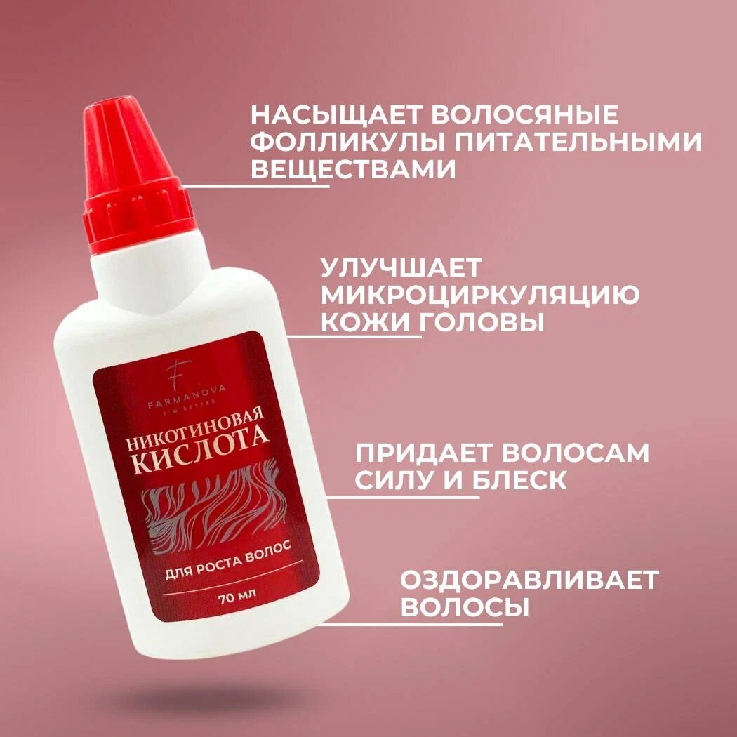 Никотиновая кислота (ниацин), известная также как витамин В3, принимает непосредственное участие в окислительно-восстановительных процессах и выработке жизненно важных ферментов для организма. Никотиновая кислота стимулирует микроциркуляцию и обмен веществ в волосяном мешочке, что способствует увеличению скорости роста волос. Средство, обогащенное растительными экстрактами – активаторами роста волос, оказывает комплексное воздействие, способствует насыщению волосяных фолликул кислородом и укреплению волос, вследствие чего приостанавливается процесс выпадения волос. Никотиновая кислота также обладает подсушивающим действием, помогая нормализации деятельности сальных желез.